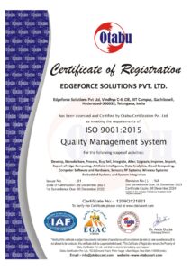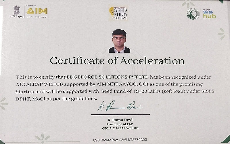 Edgeforce Solutions, Hyderabad, has been recognized by AIC ALEAP WEHUB supported by AIM, NITI AAYOG, Gol as one of the promising Startup & supported with Seed Fund Rs.20 Lakhs (soft loan) under SISFS DPIIT, MoCI.